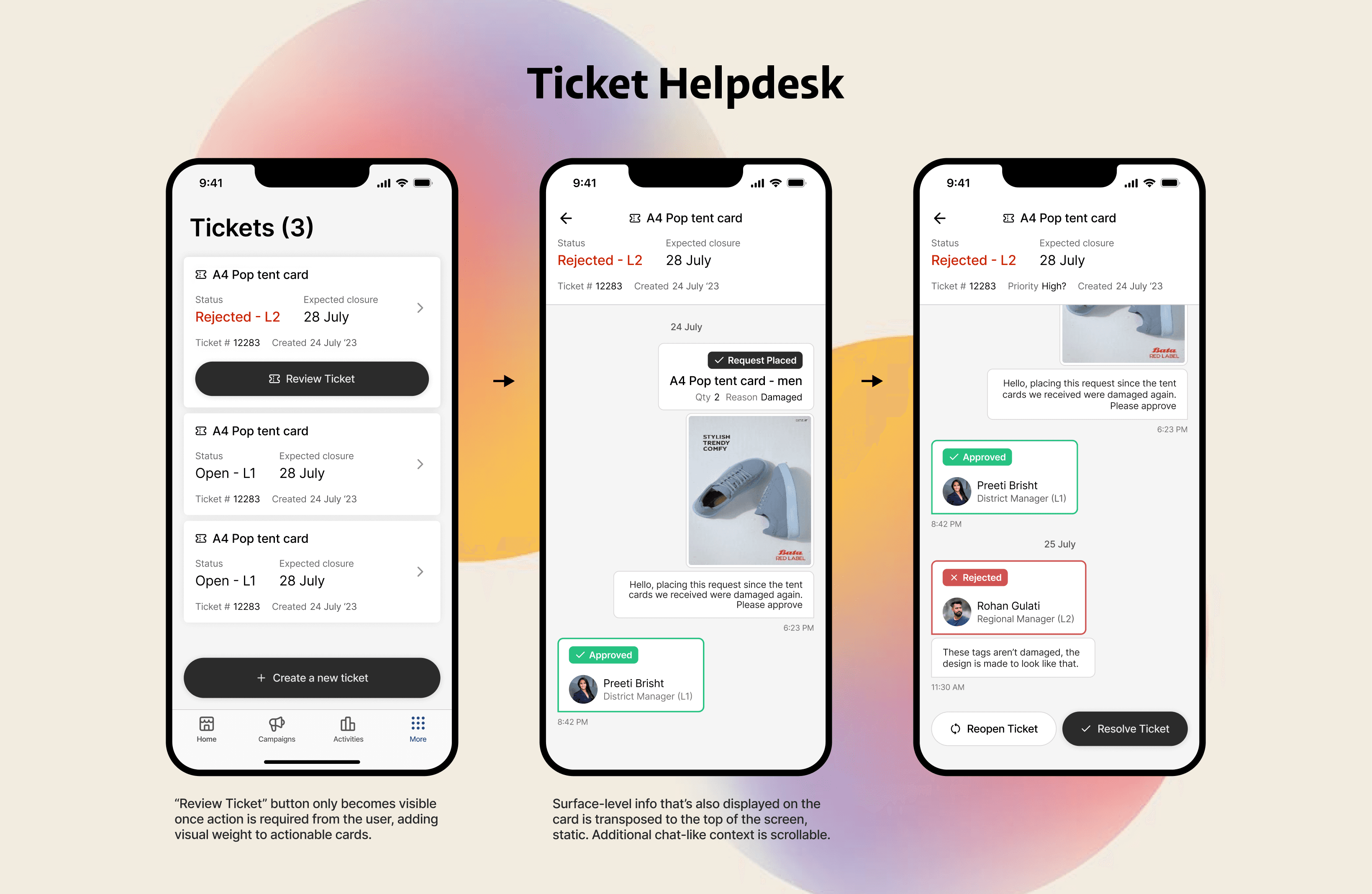 Ticket Helpdesk (new feature): Considering that tickets have a level-of-escalation system and the client wanted the app to be accessible to even those who were unfamiliar with complex management interfaces, we landed on an intuitive messaging-style UI to convey the back and forth between the ticket requester and the levels of escalation, along with any related comments.