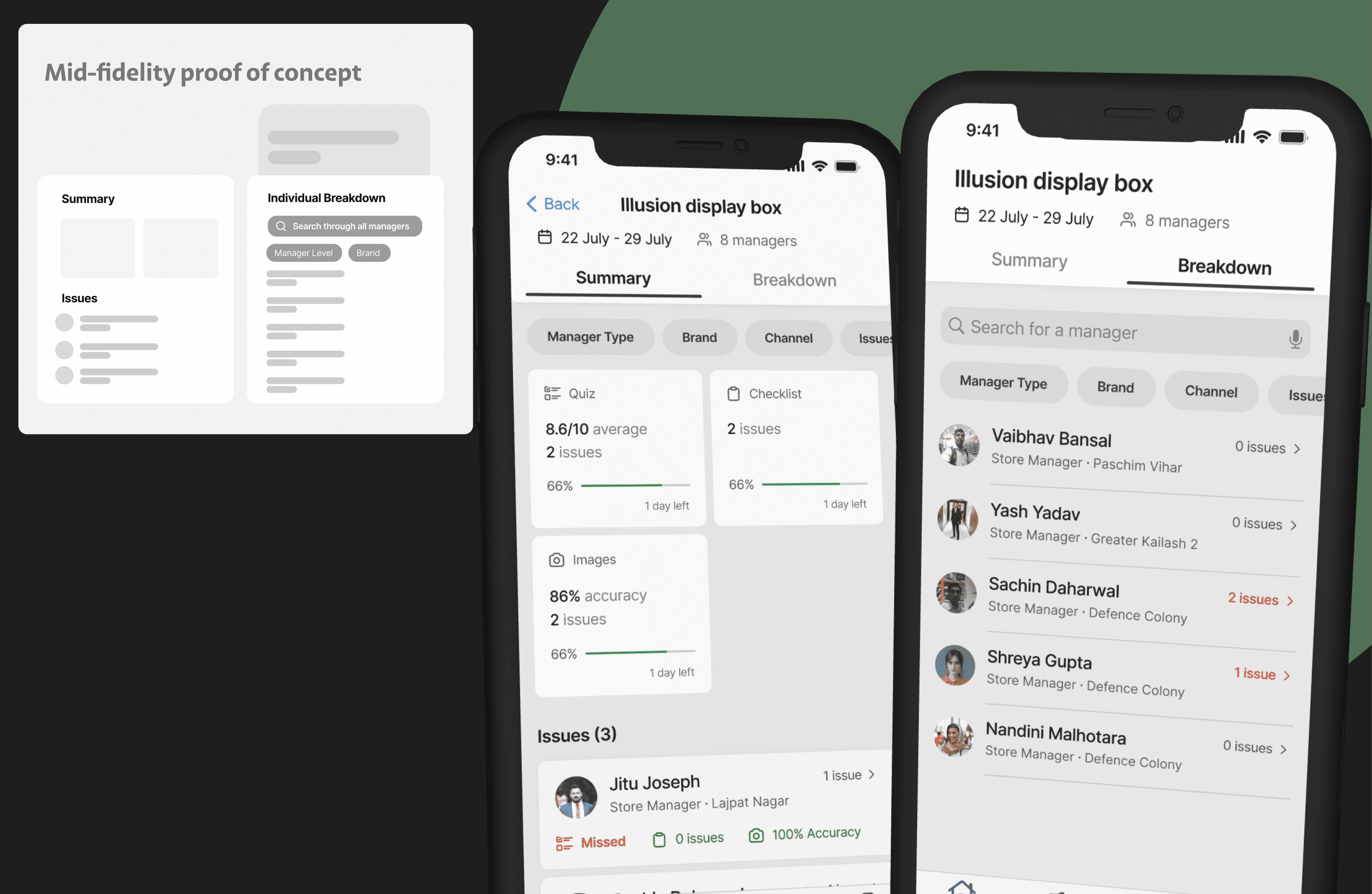Kamadhenu pioneered an AI technology that automated Visual Merchandising for Bata. As the scope of the app grew, additional features were added one-by-one, on top of each other, rather than with the task flow of users in mind. I was brought on board to redesign the app from the ground-up for two distinct user groups - store managers, who were receiving and completing tasks, and higher level managers, who were assigning and overseeing tasks.